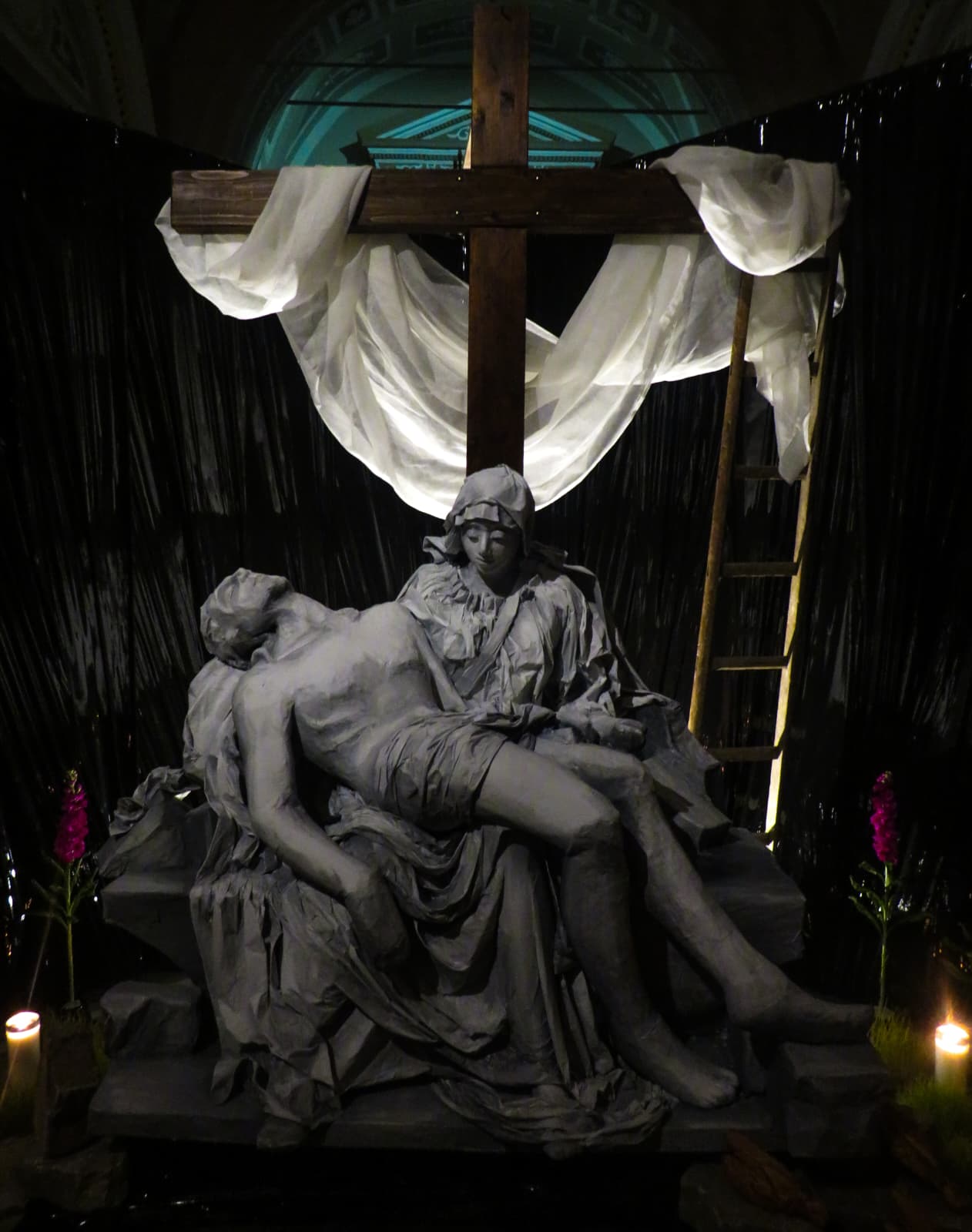 Particolarmente significativa è l’installazione centrale: una grande croce tridimensionale inclinata che rappresenta il cammino di Gesù verso il Golgota. Alla base, lo spazio è diviso in due parti. Da un lato, macerie e frammenti evocano distruzione e guerra, con il richiamo al tradimento di Giuda attraverso le trenta monete. Dall’altro lato, un terreno verde simboleggia la speranza e la rinascita. Il visitatore è invitato ad attraversare simbolicamente questo spazio, passando sotto la croce: un gesto semplice ma carico di significato, che richiama il passaggio dalla sofferenza alla redenzione e dalla guerra alla pace.