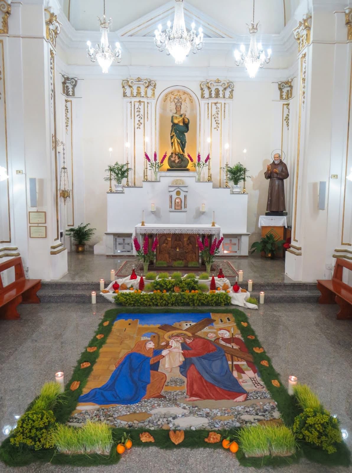Tra le tradizioni più caratteristiche c’erano anche i “lauriaddi”, germogli di grano fatti crescere al buio per settimane. Il loro colore bianco, simbolo di purezza e rinascita, veniva utilizzato per decorare l’altare della reposizione. Durante quei giorni, gruppi di famiglie e ragazzi visitavano le chiese seguendo un percorso tradizionale. Non mancavano i bambini vestiti da angioletti, monaci o suore, in un clima che univa fede e partecipazione popolare. Oggi questa tradizione rivive grazie all’impegno delle Confraternite, che dopo la riproposizione del 2024 hanno deciso di continuare anche quest’anno con una versione rinnovata. I “sabburca” sono stati allestiti dalla Domenica delle Palme fino alla Domenica in Albis nelle chiese del Collegio, Badia, San Ciro, Immacolata e San Giuseppe, oltre che nella Chiesa Madre e nella Chiesa del Convento durante il Triduo Pasquale.