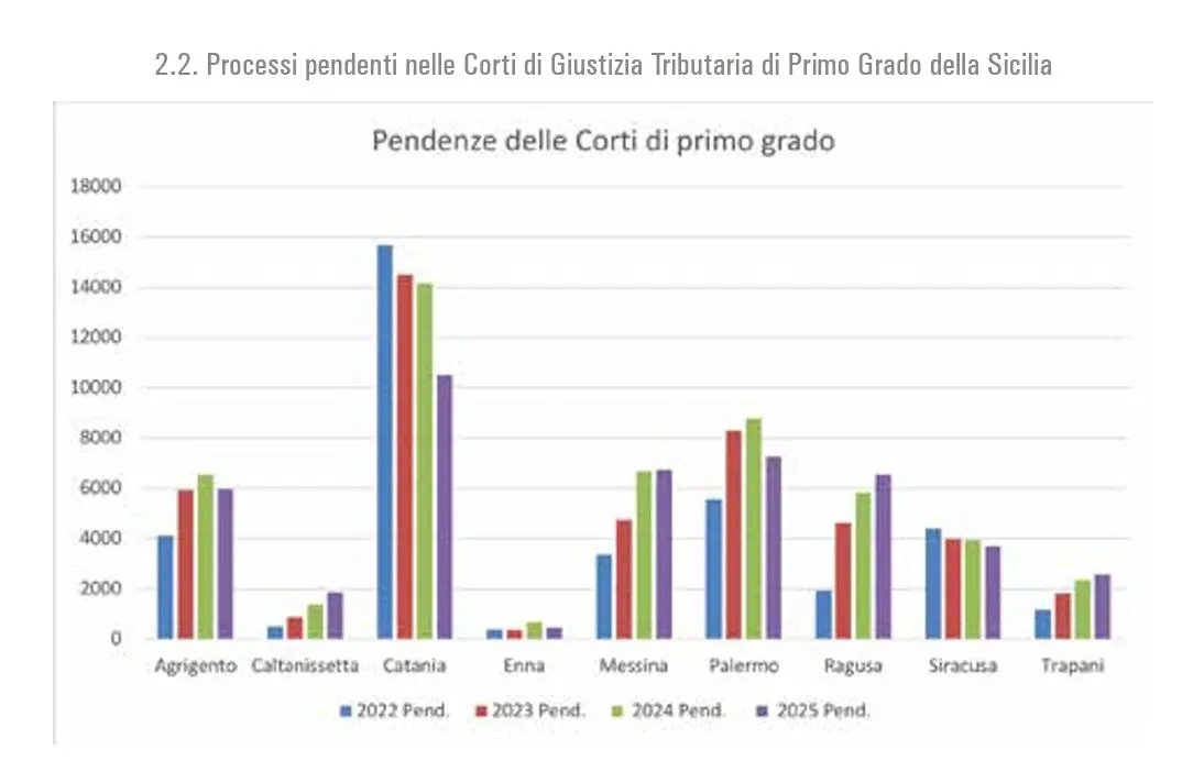 Resta molto pesante il nodo dell’arretrato nel primo grado della giustizia tributaria siciliana. “Nonostante l’elevatissimo numero di definizioni”, al 31 dicembre 2025 “risultavano pendenti davanti alle Corti di primo grado ben 45.704 controversie”, con “le punte maggiori nelle città di Catania, Messina, Palermo e Ragusa”. Lo stesso documento osserva che la situazione “non può dirsi confortante”, anche se nel 2025 si è registrato “un parziale rallentamento” del trend di crescita delle sopravvenienze.