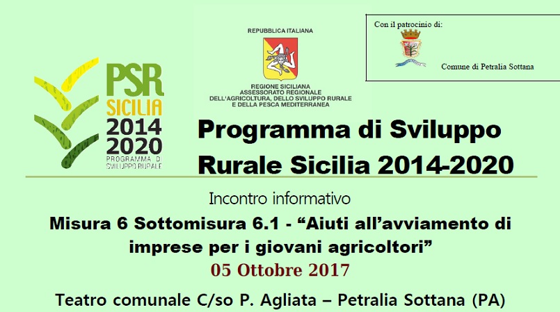 L’Ispettorato Agricoltura di Palermo, nell’ambito del Psr Sicilia 2014/2020 Misura 6, Sottomisura 6.1, organizza una giornata informativa sul tema “Aiuti all’avviamento di imprese per i giovani agricoltori”, che si terrà il 5 ottobre presso il Teatro Comunale di corso Agliata a Petralia Sottana. Sarà possibile fare domande aglie sperti per capire come partecipare al bando.